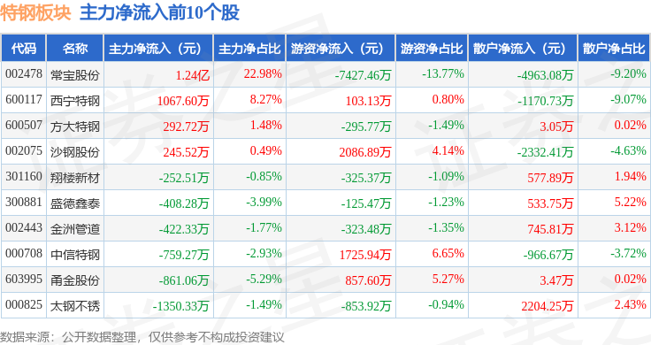 从资金流向上来看,当日特钢板块主力资金净流出2462.36万元,游资资金净流出4836.48万元,散户资金净流入7298.84万元。特钢板块个股资金流向见下表: