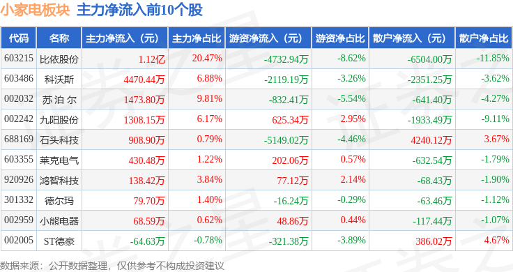 从资金流向上来看,当日小家电板块主力资金净流入7947.71万元,游资资金净流出8603.77万元,散户资金净流入656.06万元。小家电板块个股资金流向见下表:
