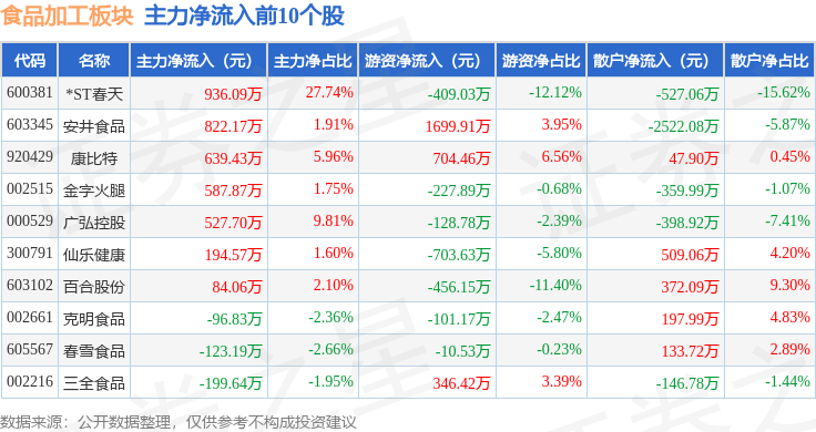 从资金流向上来看,当日食品加工板块主力资金净流出1.81亿元,游资资金净流入4548.89万元,散户资金净流入1.36亿元。食品加工板块个股资金流向见下表: