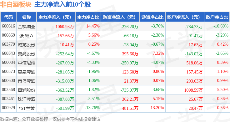 从资金流向上来看,当日非白酒板块主力资金净流出7660.75万元,游资资金净流入3265.23万元,散户资金净流入4395.52万元。非白酒板块个股资金流向见下表: