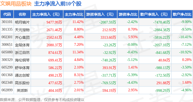 从资金流向上来看,当日文娱用品板块主力资金净流入5995.2万元,游资资金净流出512.82万元,散户资金净流出5482.38万元。文娱用品板块个股资金流向见下表:
