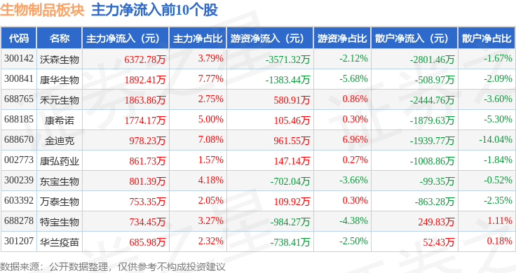 从资金流向上来看,当日生物制品板块主力资金净流出6.56亿元,游资资金净流入2.49亿元,散户资金净流入4.07亿元。生物制品板块个股资金流向见下表: