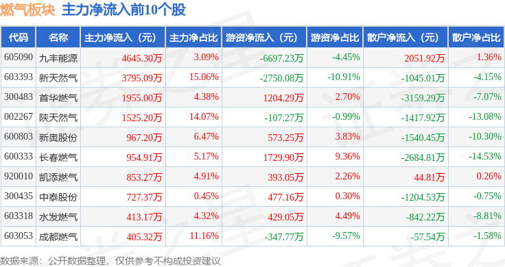 从资金流向上来看,当日燃气板块主力资金净流出2.73亿元,游资资金净流入1.45亿元,散户资金净流入1.27亿元。燃气板块个股资金流向见下表: