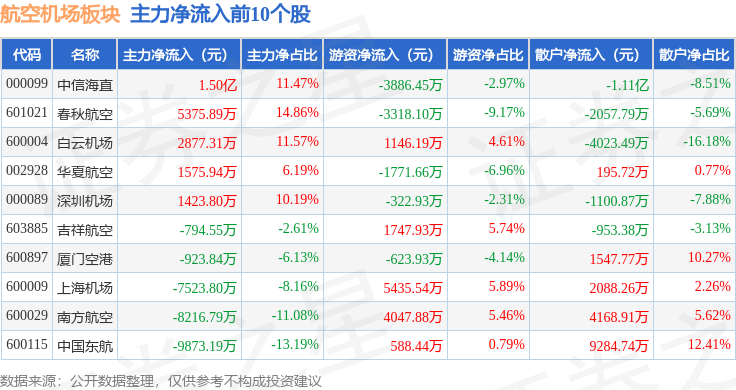 从资金流向上来看,当日航空机场板块主力资金净流出4.39亿元,游资资金净流入1.97亿元,散户资金净流入2.42亿元。航空机场板块个股资金流向见下表: