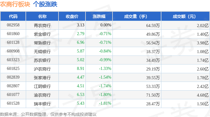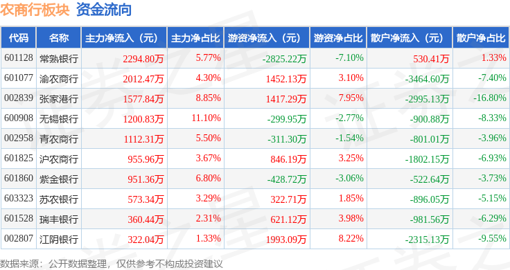 从资金流向上来看,当日农商行板块主力资金净流入1.14亿元,游资资金净流入2787.33万元,散户资金净流出1.41亿元。农商行板块个股资金流向见下表: