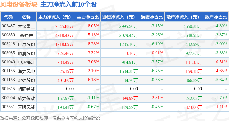 从资金流向上来看,当日风电设备板块主力资金净流出27.99亿元,游资资金净流入3.68亿元,散户资金净流入24.31亿元。风电设备板块个股资金流向见下表: