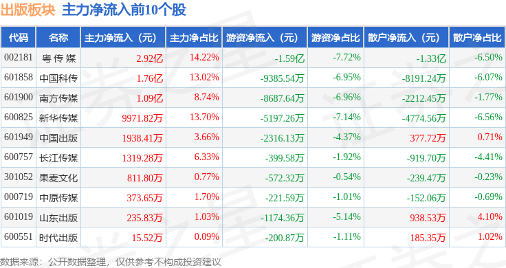 从资金流向上来看,当日出版板块主力资金净流入2.93亿元,游资资金净流出6.78亿元,散户资金净流入3.85亿元。出版板块个股资金流向见下表: