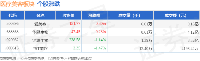 证券之星消息,1月14日医疗美容板块较上一交易日上涨0.18%,爱美客领涨。当日上证指数报收于4126.09,下跌0.31%。深证成指报收于14248.6,上涨0.56%。医疗美容板块个股涨跌见下表:
