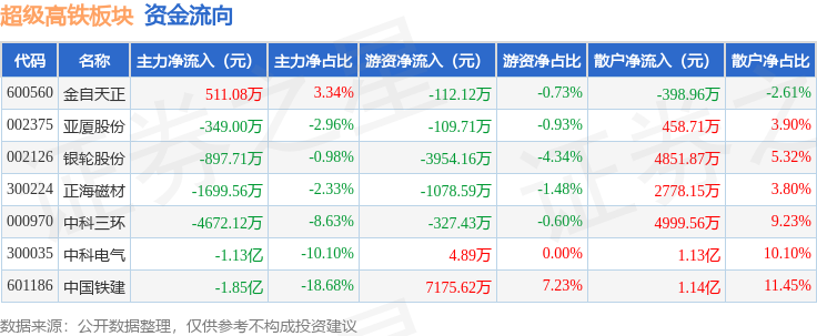 从资金流向上来看,当日超级高铁板块主力资金净流出3.69亿元,游资资金净流入1598.51万元,散户资金净流入3.53亿元。超级高铁板块个股资金流向见下表: