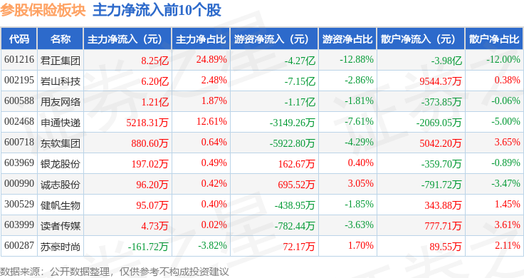 从资金流向上来看,当日参股保险板块主力资金净流出3.61亿元,游资资金净流出7.83亿元,散户资金净流入11.44亿元。参股保险板块个股资金流向见下表: