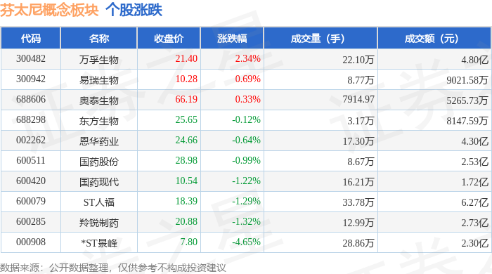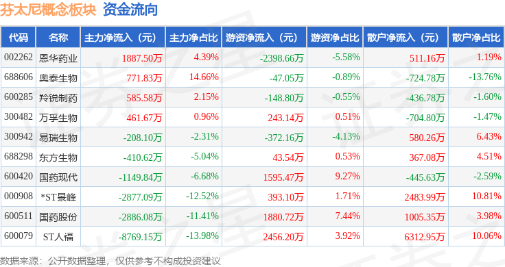 从资金流向上来看,当日芬太尼概念板块主力资金净流出1.26亿元,游资资金净流入3645.49万元,散户资金净流入8948.82万元。芬太尼概念板块个股资金流向见下表: