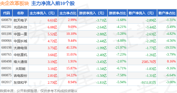 从资金流向上来看,当日央企改革板块主力资金净流出157.27亿元,游资资金净流入14.18亿元,散户资金净流入143.09亿元。央企改革板块个股资金流向见下表: