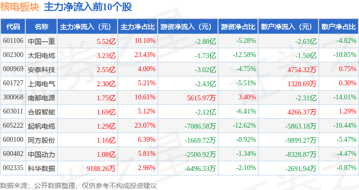 从资金流向上来看,当日核电板块主力资金净流出89.5亿元,游资资金净流入9.83亿元,散户资金净流入79.67亿元。核电板块个股资金流向见下表: