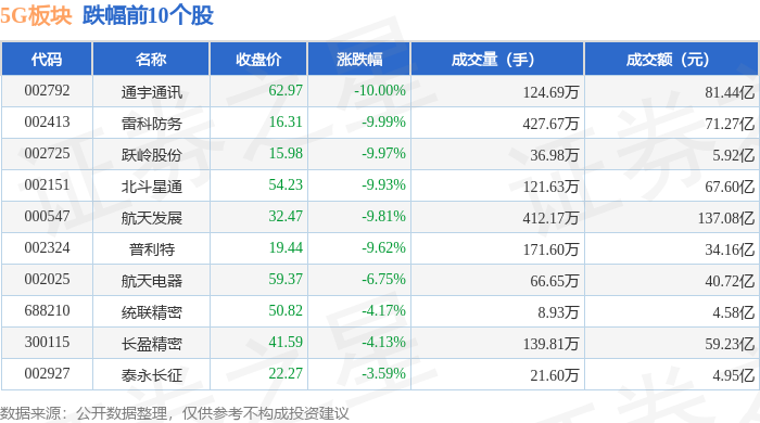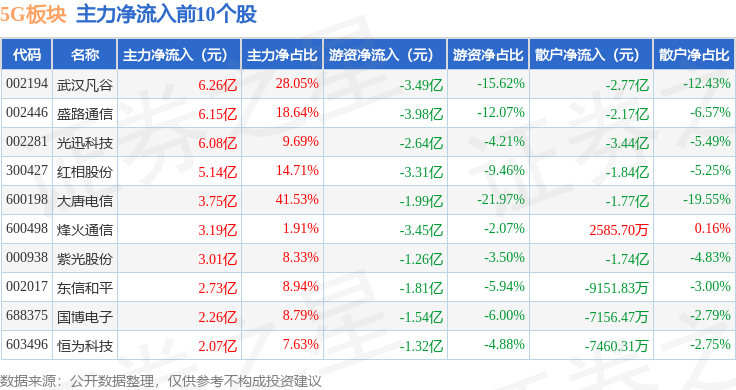 从资金流向上来看,当日5G板块主力资金净流出93.18亿元,游资资金净流出19.14亿元,散户资金净流入112.32亿元。5G板块个股资金流向见下表: