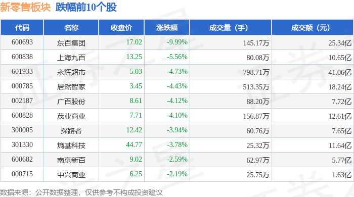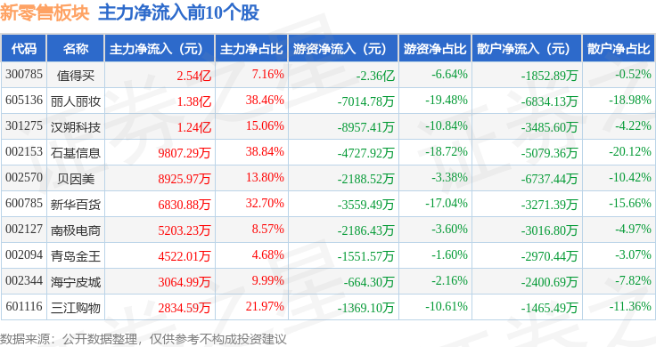 从资金流向上来看,当日新零售板块主力资金净流出16.36亿元,游资资金净流出10.06亿元,散户资金净流入26.41亿元。新零售板块个股资金流向见下表: