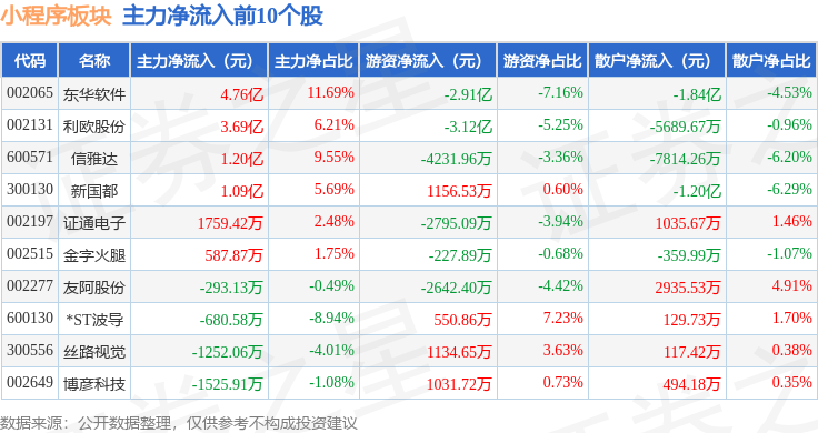 从资金流向上来看,当日小程序板块主力资金净流入7.98亿元,游资资金净流出6.51亿元,散户资金净流出1.47亿元。小程序板块个股资金流向见下表: