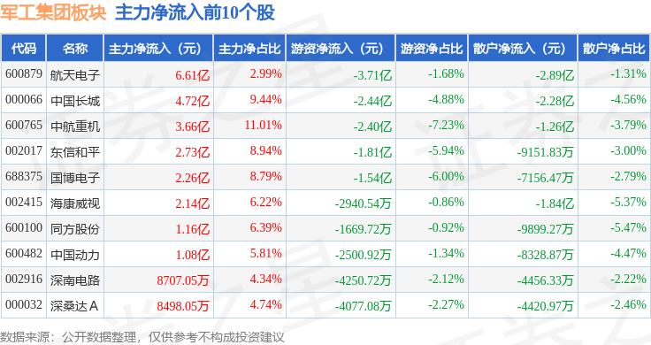 从资金流向上来看,当日军工集团板块主力资金净流出74.88亿元,游资资金净流出10.13亿元,散户资金净流入85.01亿元。军工集团板块个股资金流向见下表: