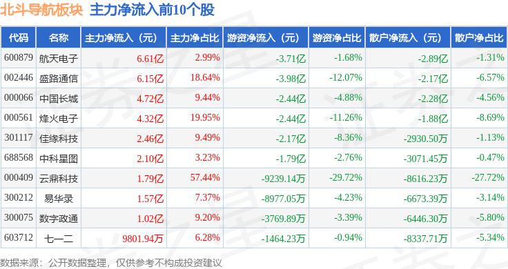 从资金流向上来看,当日北斗导航板块主力资金净流出65.96亿元,游资资金净流出4.19亿元,散户资金净流入70.15亿元。北斗导航板块个股资金流向见下表: