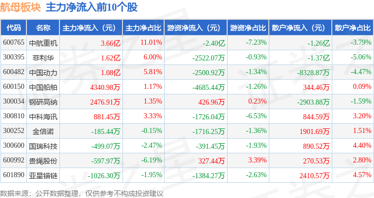 从资金流向上来看,当日航母板块主力资金净流出12.49亿元,游资资金净流出4.17亿元,散户资金净流入16.66亿元。航母板块个股资金流向见下表: