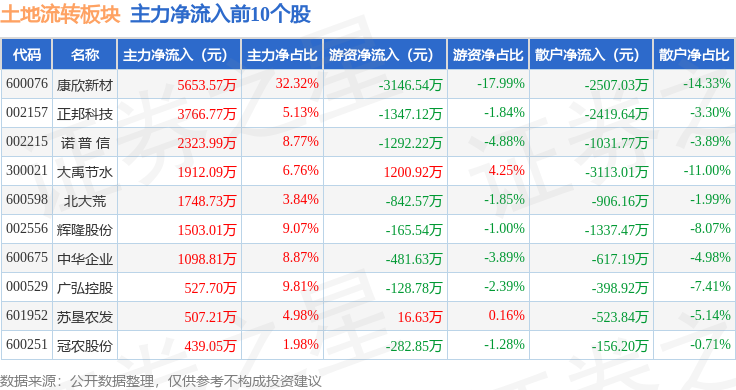 从资金流向上来看,当日土地流转板块主力资金净流出2.84亿元,游资资金净流出9146.45万元,散户资金净流入3.76亿元。土地流转板块个股资金流向见下表: