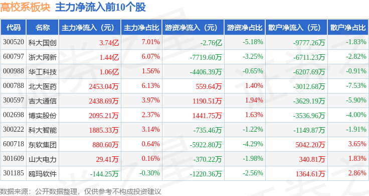 从资金流向上来看,当日高校系板块主力资金净流入2.04亿元,游资资金净流出4.06亿元,散户资金净流入2.02亿元。高校系板块个股资金流向见下表: