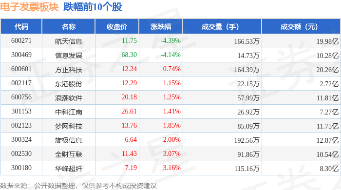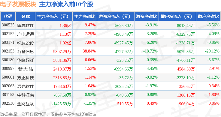 从资金流向上来看,当日电子发票板块主力资金净流出7429.48万元,游资资金净流出1.88亿元,散户资金净流入2.63亿元。电子发票板块个股资金流向见下表: