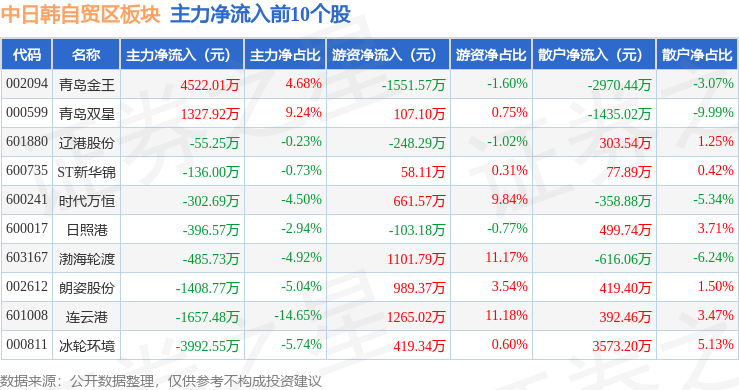 从资金流向上来看,当日中日韩自贸区板块主力资金净流出6.03亿元,游资资金净流入2.02亿元,散户资金净流入4.01亿元。中日韩自贸区板块个股资金流向见下表: