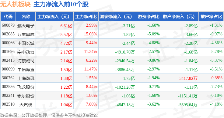 从资金流向上来看,当日无人机板块主力资金净流出69.61亿元,游资资金净流出1.41亿元,散户资金净流入71.02亿元。无人机板块个股资金流向见下表: