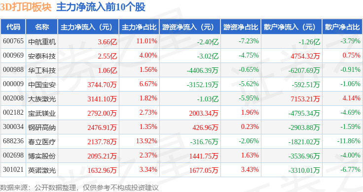 从资金流向上来看,当日3D打印板块主力资金净流出18.35亿元,游资资金净流出5.11亿元,散户资金净流入23.46亿元。3D打印板块个股资金流向见下表: