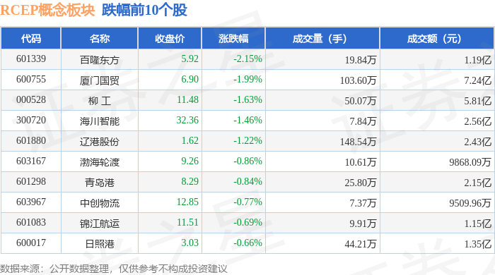 从资金流向上来看,当日RCEP概念板块主力资金净流入12.19亿元,游资资金净流出8.54亿元,散户资金净流出3.65亿元。RCEP概念板块个股资金流向见下表: