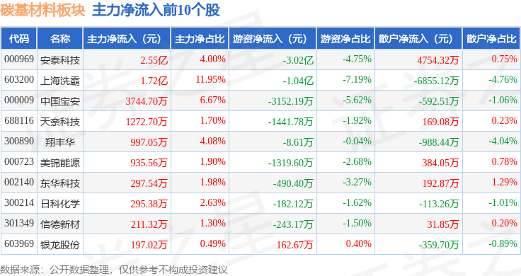 从资金流向上来看,当日碳基材料板块主力资金净流出15.52亿元,游资资金净流出7014.38万元,散户资金净流入16.22亿元。碳基材料板块个股资金流向见下表: