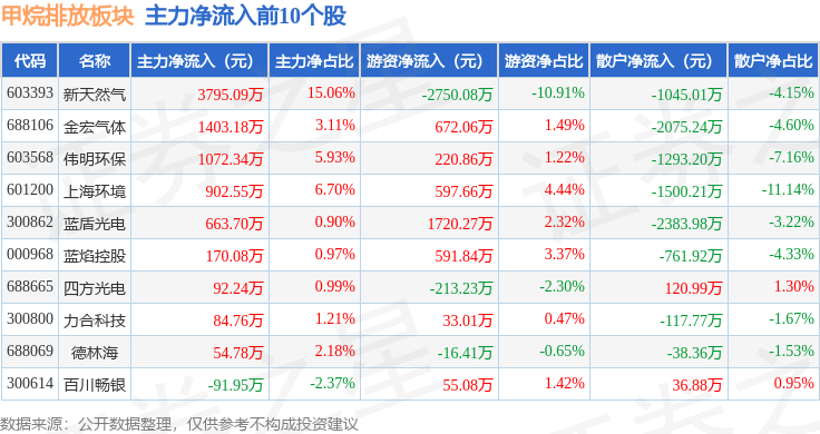 从资金流向上来看,当日甲烷排放板块主力资金净流出3870.28万元,游资资金净流出235.81万元,散户资金净流入4106.09万元。甲烷排放板块个股资金流向见下表: