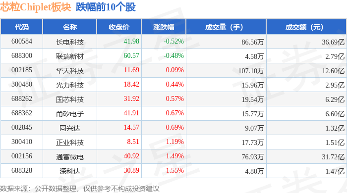 从资金流向上来看,当日芯粒Chiplet板块主力资金净流出1.78亿元,游资资金净流出2.07亿元,散户资金净流入3.85亿元。芯粒Chiplet板块个股资金流向见下表: