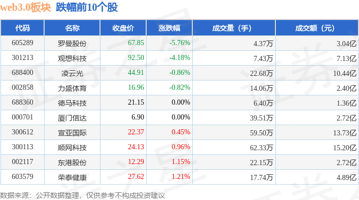 从资金流向上来看,当日web3.0板块主力资金净流入3.08亿元,游资资金净流出9.85亿元,散户资金净流入6.76亿元。web3.0板块个股资金流向见下表: