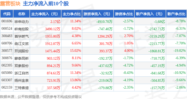 从资金流向上来看,当日露营板块主力资金净流出1112.47万元,游资资金净流入6429.3万元,散户资金净流出5316.83万元。露营板块个股资金流向见下表: