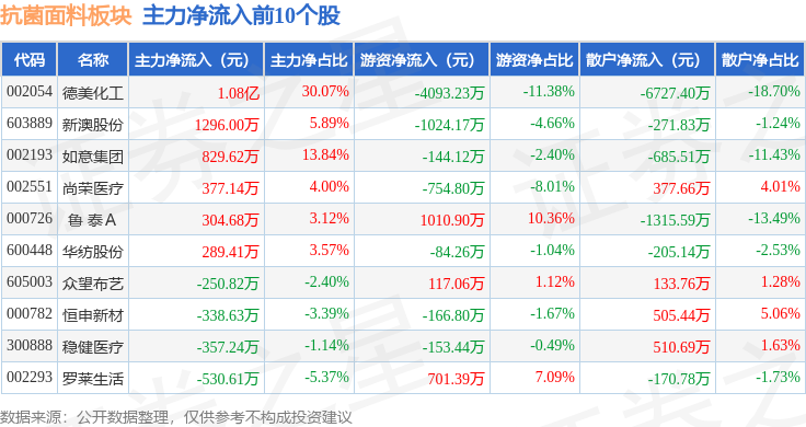 从资金流向上来看,当日抗菌面料板块主力资金净流出2.76亿元,游资资金净流入1959.43万元,散户资金净流入2.57亿元。抗菌面料板块个股资金流向见下表: