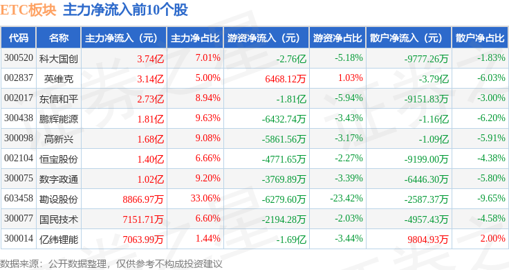 从资金流向上来看,当日ETC板块主力资金净流入12.68亿元,游资资金净流出8.69亿元,散户资金净流出3.99亿元。ETC板块个股资金流向见下表: