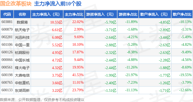 从资金流向上来看,当日国企改革板块主力资金净流出211.21亿元,游资资金净流入13.07亿元,散户资金净流入198.14亿元。国企改革板块个股资金流向见下表: