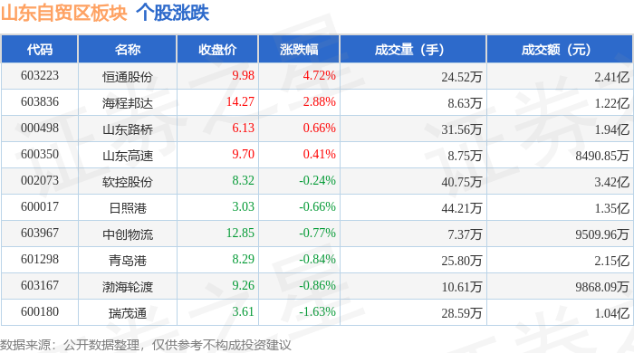 从资金流向上来看,当日山东自贸区板块主力资金净流出6580.19万元,游资资金净流入1.01亿元,散户资金净流出3489.78万元。山东自贸区板块个股资金流向见下表: