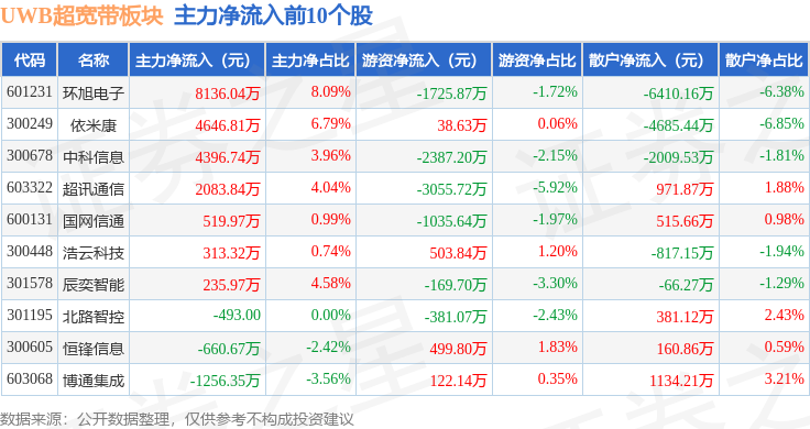 从资金流向上来看,当日UWB超宽带板块主力资金净流出15.16亿元,游资资金净流入5.23亿元,散户资金净流入9.94亿元。UWB超宽带板块个股资金流向见下表: