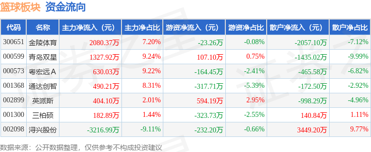 从资金流向上来看,当日篮球板块主力资金净流入1898.53万元,游资资金净流出360.07万元,散户资金净流出1538.47万元。篮球板块个股资金流向见下表: