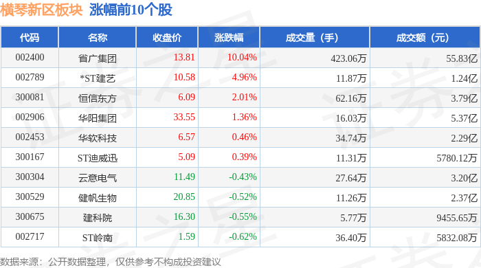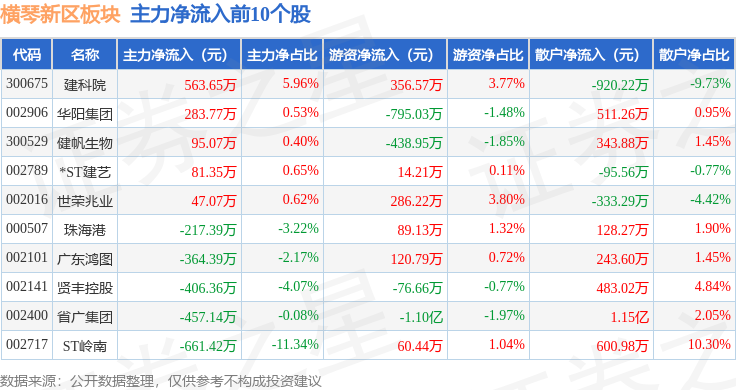 从资金流向上来看,当日横琴新区板块主力资金净流出3.62亿元,游资资金净流出5830.51万元,散户资金净流入4.21亿元。横琴新区板块个股资金流向见下表: