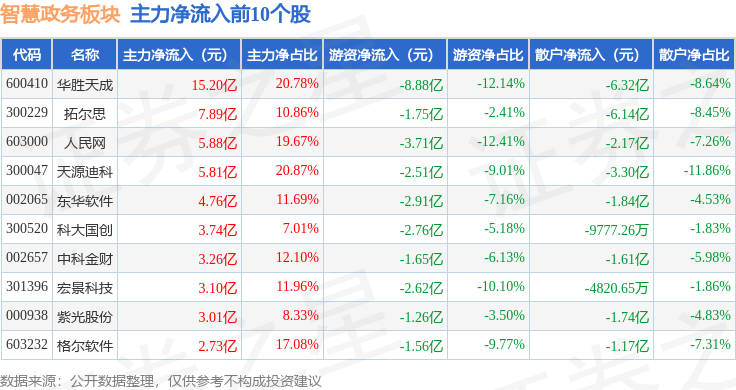 从资金流向上来看,当日智慧政务板块主力资金净流入55.35亿元,游资资金净流出53.06亿元,散户资金净流出2.29亿元。智慧政务板块个股资金流向见下表: