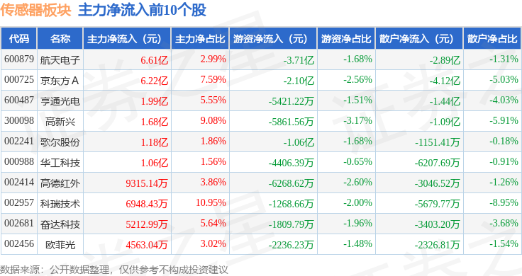 从资金流向上来看,当日传感器板块主力资金净流出43.43亿元,游资资金净流入1.27亿元,散户资金净流入42.16亿元。传感器板块个股资金流向见下表: