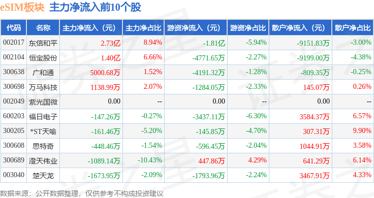 从资金流向上来看,当日eSIM板块主力资金净流入2.2亿元,游资资金净流出2.74亿元,散户资金净流入5414.69万元。eSIM板块个股资金流向见下表: