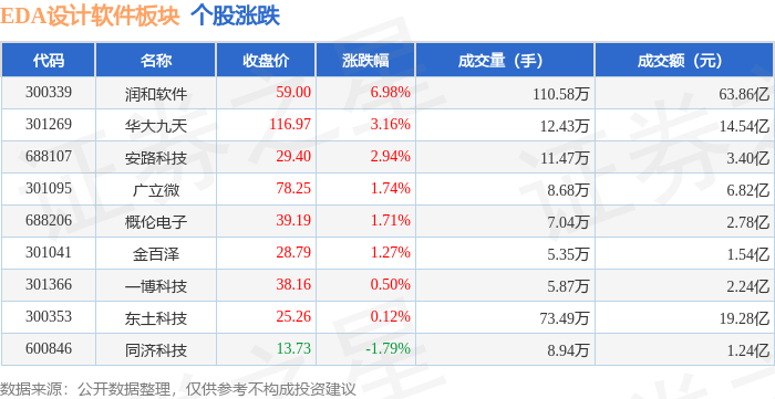 证券之星消息,1月14日EDA设计软件板块较上一交易日上涨2.37%,润和软件领涨。当日上证指数报收于4126.09,下跌0.31%。深证成指报收于14248.6,上涨0.56%。EDA设计软件板块个股涨跌见下表: