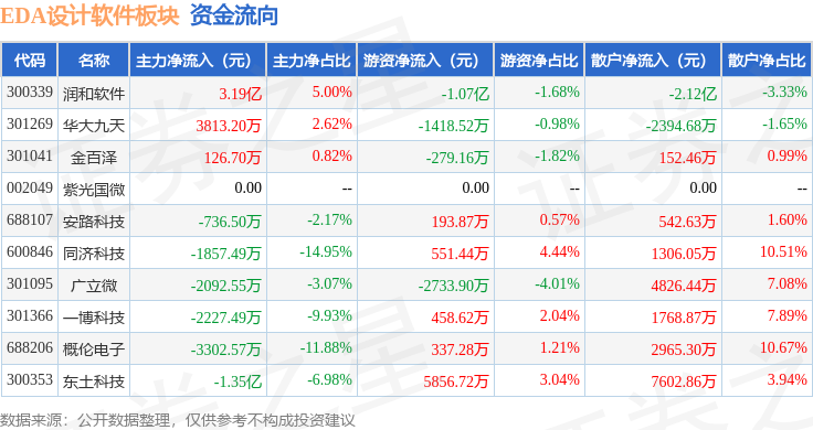 从资金流向上来看,当日EDA设计软件板块主力资金净流入1.22亿元,游资资金净流出7744.1万元,散户资金净流出4465.22万元。EDA设计软件板块个股资金流向见下表: