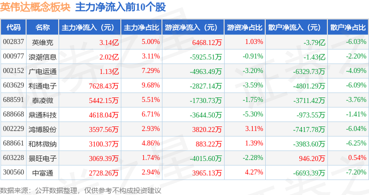 从资金流向上来看,当日英伟达概念板块主力资金净流出33.56亿元,游资资金净流出8165.41万元,散户资金净流入34.38亿元。英伟达概念板块个股资金流向见下表: