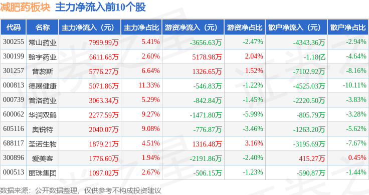 从资金流向上来看,当日减肥药板块主力资金净流出11.43亿元,游资资金净流入2.04亿元,散户资金净流入9.39亿元。减肥药板块个股资金流向见下表: