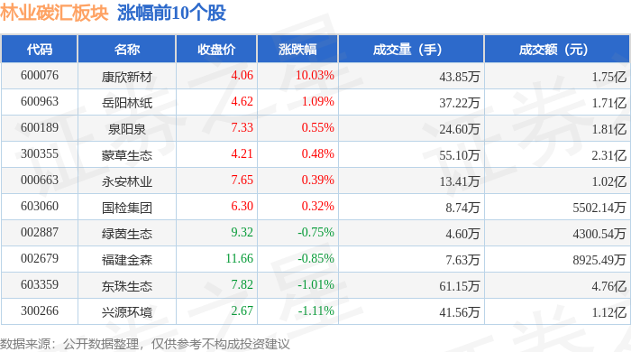 证券之星消息,1月14日林业碳汇板块较上一交易日上涨1.05%,康欣新材领涨。当日上证指数报收于4126.09,下跌0.31%。深证成指报收于14248.6,上涨0.56%。林业碳汇板块个股涨跌见下表: